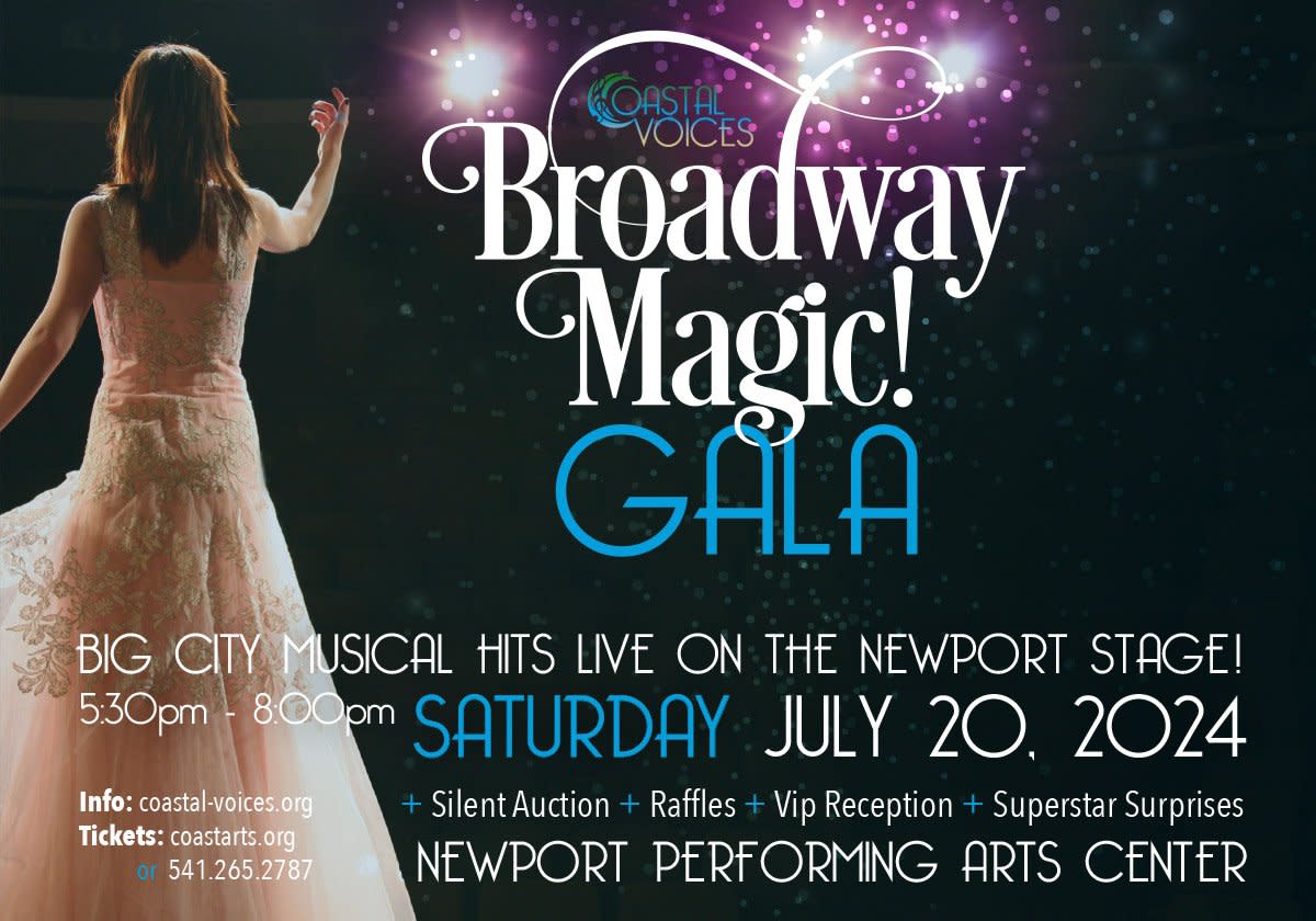 We’re excited to announce Broadway Magic!—our inaugural fundraising gala. This glitzy, glamorous affair will feature vocal performances of musical theatre hits from classic and contemporary shows including Candide, Kiss Me Kate, My Fair Lady, Rent, West Side Story, and more. The event will showcase top local talent live on the Newport Performing Arts Center main stage, complemented by a variety of pre-show activities to ensure a memorable and magical evening. Your $25 general admission ticket includes the show and access to the silent auction and raffle games in the PAC lobby; $50 VIP tickets also include a reception featuring gourmet appetizers crafted by William Webster, most recently Chef de cuisine at Tables of Content Restaurant in Newport, OR, and a variety of wines courtesy of Beach Daisy Wine in Yachats, OR. If you’re feeling especially daring, the limited $100 Superstar tickets offer the pre-show events, gourmet reception, a commemorative gift, and your name sung in a song from the stage! (This could also be a unique way to pay tribute to a loved one!) The gala is black-tie-optional (yes, you are encouraged to gussy up in your tux, evening gown, cocktail, or business attire—we won’t judge). Proceeds will support venue rentals, musician/artist stipends, equipment, transportation, and all of the expenses of bringing music and harmony to the Central Coast.Images