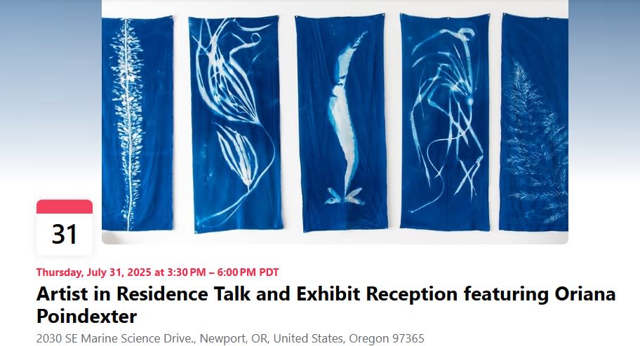 Hatfield Artist in Residence Oriana Poindexter is both an artist and marine scientist with an academic background spanning photography, fisheries, and marine conservation. She dives, photographs, and collects specimens to create photo-based works that document the ocean’s shifting ecosystems. Oriana will present an artist talk about the work she has done during her residency at Hatfield from 3:30 - 4:30 p.m. at the Carmen Ford Phillips Auditorium in the Gladys Valley Marine Studies Building at Hatfield Marine Science Center in Newport. An exhibit reception will be held afterward from 4:30 - 6 p.m. The public is welcome to attend. The art exhibit will be on display until mid-December and is free to the public.Images