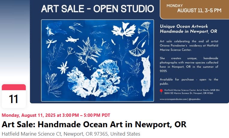 Join Artist in Residence Oriana Poindexter at the Hatfield Marine Science Center in Newport, Oregon for an open studio sale at the conclusion of her time on the Oregon Coast. Monday, August 11, 2025 from 3-5pm 📍 Hatfield Marine Science Center Artist Studio Gladys Marine Studies Building Room 284 2030 SE Marine Science Dr, Newport OR 97365 Open to the public. Artwork created during Oriana’s residency will be available for direct purchase. This is a unique opportunity to collect new work that is site-specific to the Oregon coast. Cash preferred, cards and Venmo accepted.Images